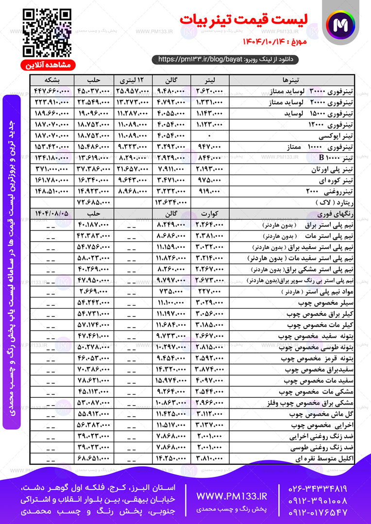 لیست قیمت رنگلیست قیمت بروز محصولات تینر بیات