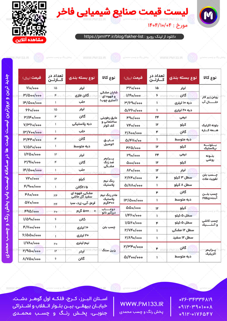 منظور از لیست موقت : امکان تغییر این لیست قیمت در روز های آتی بسیار زیاد است لطفا مجددا این صفحه را در روز های آتی بارگذاری کنید یا به سامانه لیست یاب پخش رنگ و چسب محمدی رجوع کنید تا از آخرین تغییرات این لیست قیمت با خبر شوید. همچنین شما میتوانید قبل ثبت سفارش ، و کالا های درخواستی خودر را از واحد های فروش پخش رنگ و چسب محمدی استعلام بگیرید. راه های ارتباطی با پخش رنگ و چسب محمدی در پایین همین صفحه درج شده است.