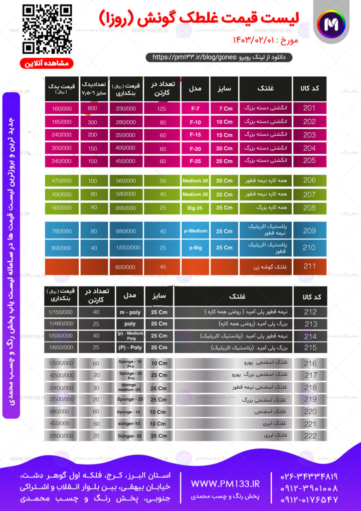 لیست قیمت ابزارلیست قیمت بروز غلطک رنگ گونش و روژان