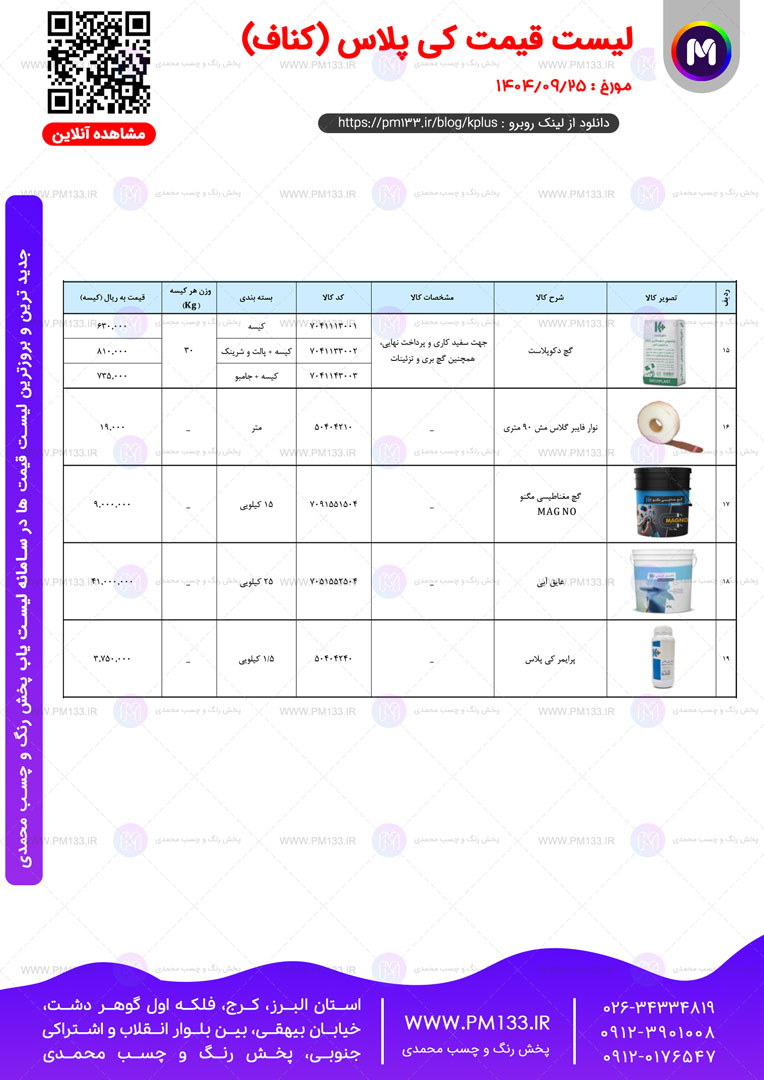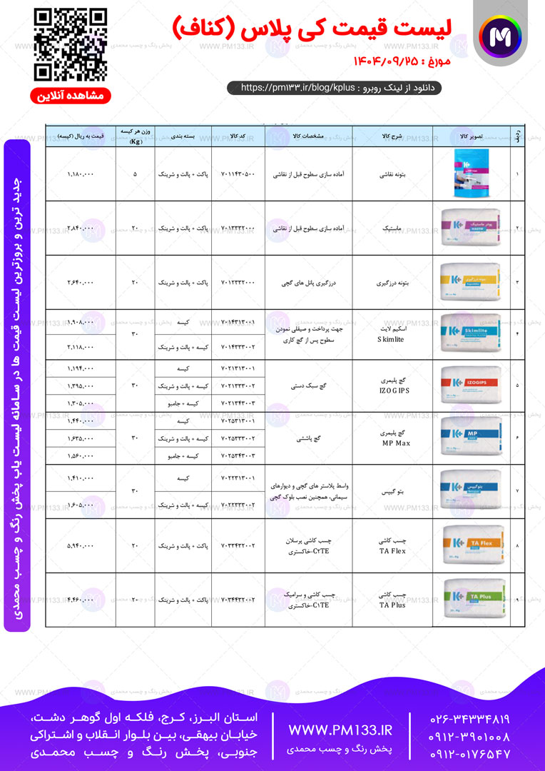 این صفحه جهت درج و اطلاع رسانی جدید ترین لیست قیمت محصولات کی پلاس و کناف سابق طراحی شده است که شما میتوانید از آخرین تغییرات قیمت محصولات k plus و کناف با خبر شوید. همچنین اطلاعاتی در مورد محصولات و بیوگرافی کی پلاس جهت اطلاع شما نیز در سایت قرار داده شده است.