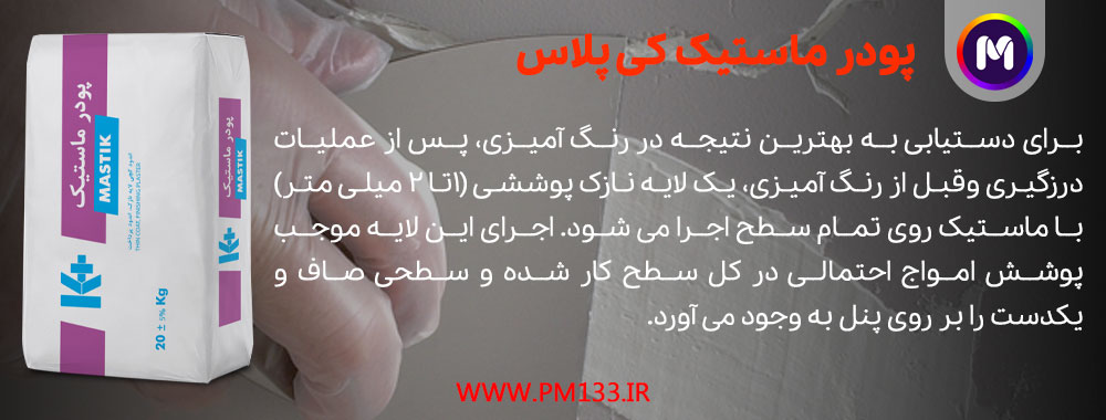 برای دستیابی به بهترین نتیجه در رنگ آمیزی، پس از عملیات درزگیری وقبل از رنگ آمیزی، یک لایه نازک پوششی (۱تا ۲ میلی متر) با ماستیک روی تمام سطح اجرا می شود. اجرای این لایه موجب پوشش امواج احتمالی در کل سطح کار شده و سطحی صاف و یکدست را بر روی پنل به وجود می آورد. این محصول برای ایجاد یک سطح صاف و جلوگیری از ایجاد حالت سایه و روشن و نمایان شدن محل درزها (که حاصل اختلاف نوع مصالح زیر رنگ می باشد)، پس از عملیات درزگیری و قبل از رنگ آمیزی به کار می رود.