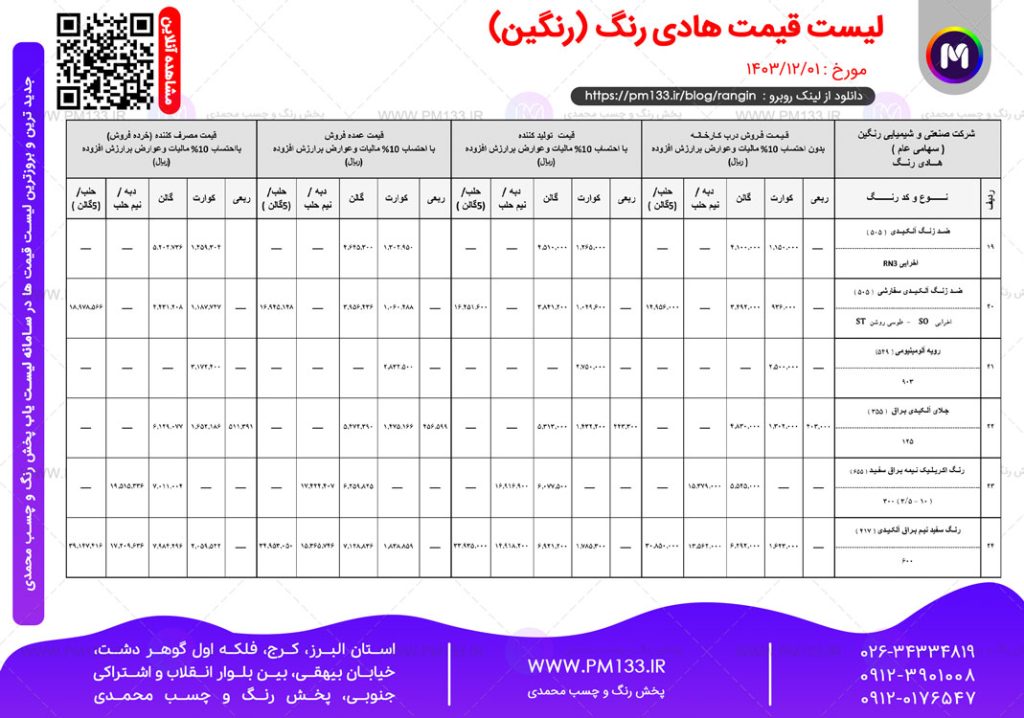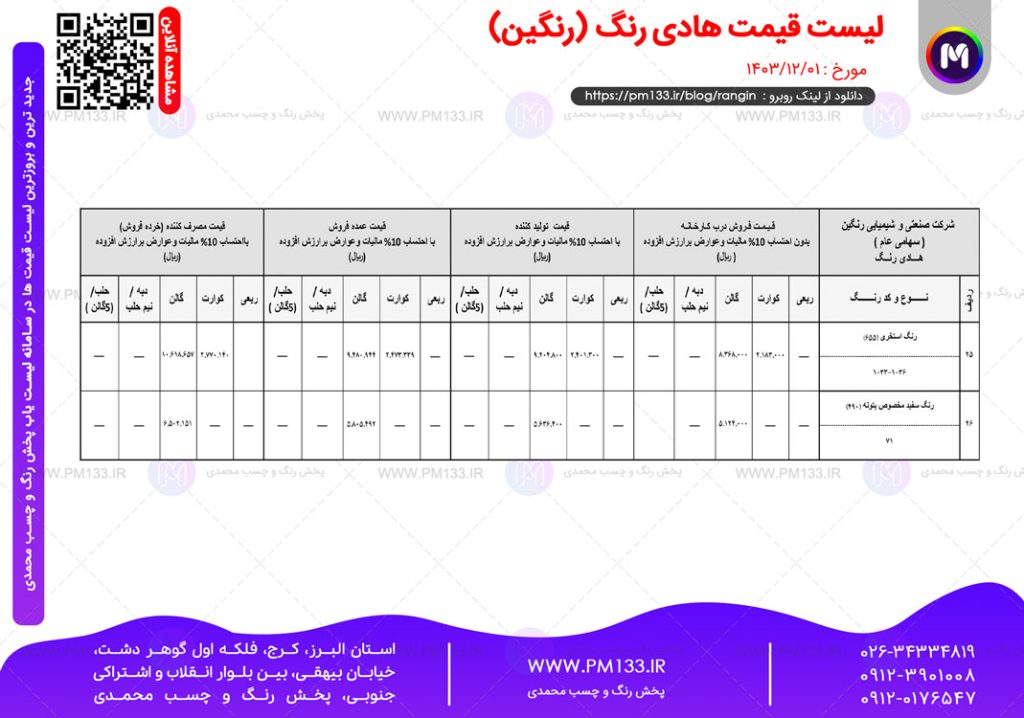 لیست قیمت رنگلیست قیمت بروز محصولات شرکت رنگین (هادی رنگ)
